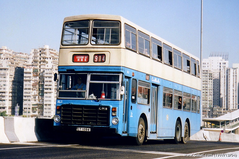![]() CMB's 2 three-axle Volvo Ailsa B55-10s were two of the only three in the world. Last route served by AL1 (CT 1094) was 914 before the bus retired. (1997/12/04) |